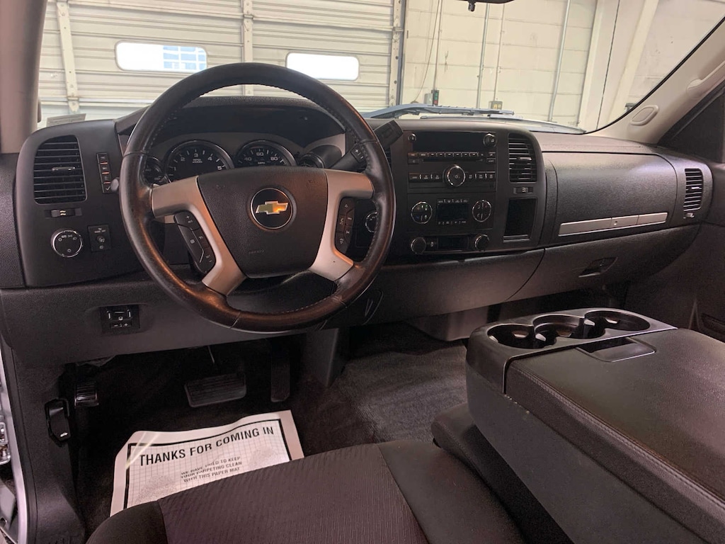 includes Vortec 5.3L V8 SFI FlexFuel engine, (G80) heavy-duty automatic locking rear differential, (CJ2) dual-zone automatic air conditioning, (UPF) Bluetooth® for phone, (UK3) steering wheel-mounted audio controls, (UUI) AM/FM stereo with CD player and MP3 playback, (AG1) driver 6-way power seat adjuster, (A60) locking tailgate, (PPA) EZ-lift tailgate, (Z82) Trailering package and (P46) 4 - 17 x 7.5 (43.2 cm x 19.1 cm) 6-lug aluminum wheels, capable of running on unleaded or up to 85% ethanol (with gas - 315 hp [234.8 kW] @ 5200 rpm, 335 lb-ft of torque [452.2 N-m] @ 4000 rpm), aluminum block, includes trailering hitch platform and 2-inch receiver, 7- wire harness (harness includes wires for: park lamps, backup lamps, right turn, left turn, electric brake lead, battery and ground) with independent fused trailering circuits mated to a 7-way sealed connector, wiring harness for after-market trailer brake controller (located in the instrument panel harness) and (KNP) external transmission oil cooler (with (MYC) 6-speed automatic transmission also includes (K5L) heavy-duty cooling package and (KC4) external engine oil cooler) (Also includes (G80) heavy-duty automatic locking rear differential on Retail orders and with (WEA) Z71 Appearance Package on Fleet or Government Orders.), center fold-down armrest with storage, lockable storage compartment in seat cushion (includes auxiliary power outlet), adjustable outboard head restraints and storage pockets on Extended and Crew Cab models (STD), with overdrive and tow/haul mode. Includes Cruise Grade Braking and Powertrain Grade Braking, auxiliary input jack, seek-and-scan, digital clock, auto-tone control, Radio Data System (RDS), automatic volume, TheftLock and 36 cross-band presets. Chevrolet LT with Silver Ice Metallic exterior and Ebony interior features a 8 Cylinder Engine with 302 HP at 5600 RPM*. Serviced here, Originally bought here, Local Trade-In