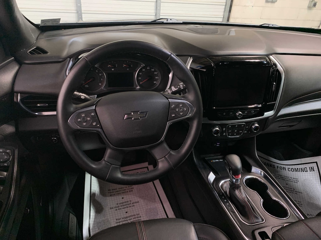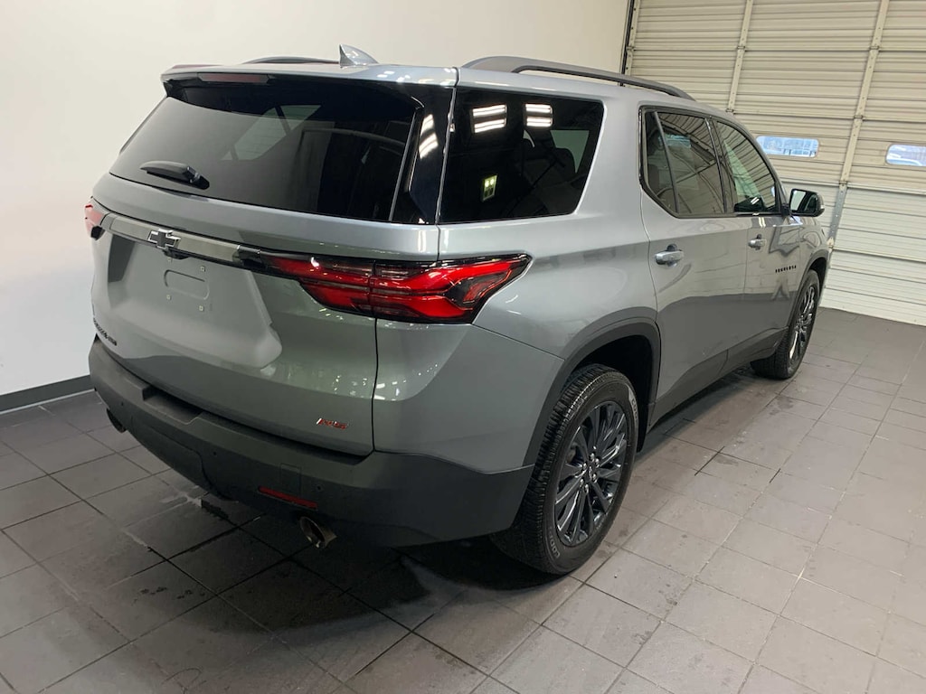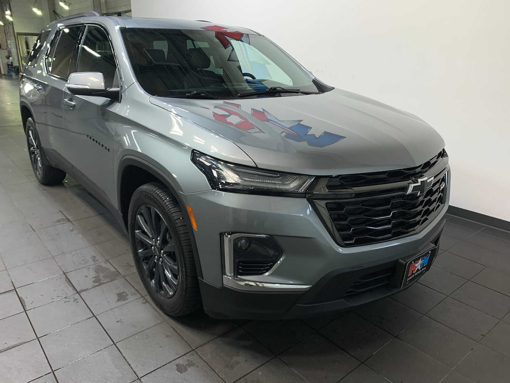 with tilt-sliding front and fixed rear, includes power rear sunscreen, includes (V08) heavy-duty cooling system, trailer hitch and (CTT) trailering assist guidelines (Includes (PZ8) Hitch Guidance with Hitch View.), includes (RIA) front and second row all-weather floor liner, LPO, (RIB) third row all-weather floor liner, LPO and (CAV) integrated cargo liner, LPO, with connected Navigation, 8 diagonal HD color touchscreen, AM/FM stereo, Bluetooth® audio streaming for 2 active devices, Apple CarPlay® and Android Auto® capable, enhanced voice recognition, in-vehicle apps, cloud connected personalization for select infotainment and vehicle settings. Subscription required for enhanced and connected services after trial period (STD), (310 hp [232.0 kW] @ 6800 rpm, 266 lb-ft of torque [361 N-m] @ 2800 rpm) (STD), (STD). Chevrolet RS with Sterling Gray Metallic exterior and Jet Black/Spice Red interior features a V6 Cylinder Engine with 310 HP at 6800 RPM*.