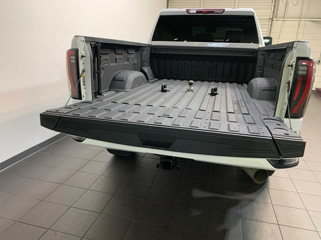 (470 hp [350.5 kW] @ 2800 rpm, 975 lb-ft of torque [1322 Nm] @ 1600 rpm) (Includes (K05) engine block heater.), includes LED lighting, Gooseneck ball and chain tiedown kit with case, (dealer-installed), includes color touch-screen, multi-touch display, AM/FM stereo, Bluetooth® streaming audio for music and most phones; featuring wireless Android Auto® and Apple CarPlay® capability for compatible phones (STD), TRANSMISSION, ALLISON 10-SPEED AUTOMATIC. GMC AT4 with Summit White exterior and Jet Black with Kalahari accents interior features a 8 Cylinder Engine with 470 HP at 2800 RPM*.