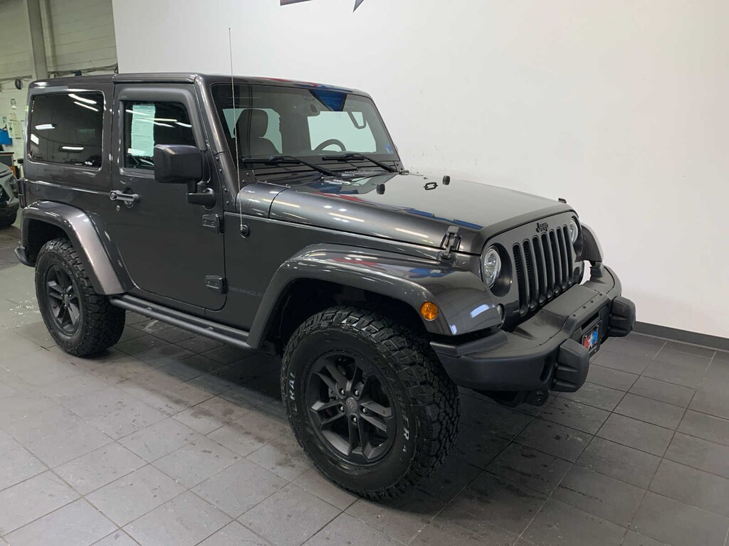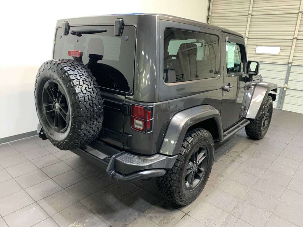 Engine: 3.6L V6 24V VVT, Transmission: 5-Speed Automatic (W5A580), BF Goodrich Brand Tires, Black Jeep Grille Badge, Piano Black Interior Accents, Delete Tow Hooks, Low Gloss Black Wrangler Decal, Body Color Grille w/Black Accent, Winter Package Decals, R1234YF A/C Refrigerant, Black Fuel Filler Door, Delete Sahara Badge, Remote Start System, MOPAR Black Tail Lamp Guards, MOPAR Coat Hooks & Grab Handles, Vehicle Information Center, Remote USB Port, Uconnect Voice Command w/Bluetooth®, Tire Pressure Monitoring Display, Diesel Gray Interior Accents, Delete Floor Mats, MOPAR Rock Rails, MOPAR Winch-Capable HD Front Bumper, Winter Edition Package, MOPAR HD Rear Bumper, Tip Start, Hill Descent Control, If ordering without AEM (Dual Top Group), the black soft top will not be included, Freedom Panel Storage Bag, Rear Window Defroster, Rear Window Wiper/Washer, RADIO: 430, Humidity Sensor, Air Filtering, (STD). Jeep Winter with Granite Crystal Metallic Clearcoat exterior and Black interior features a V6 Cylinder Engine with 285 HP at 6400 RPM*. New Tires, Local Trade-In