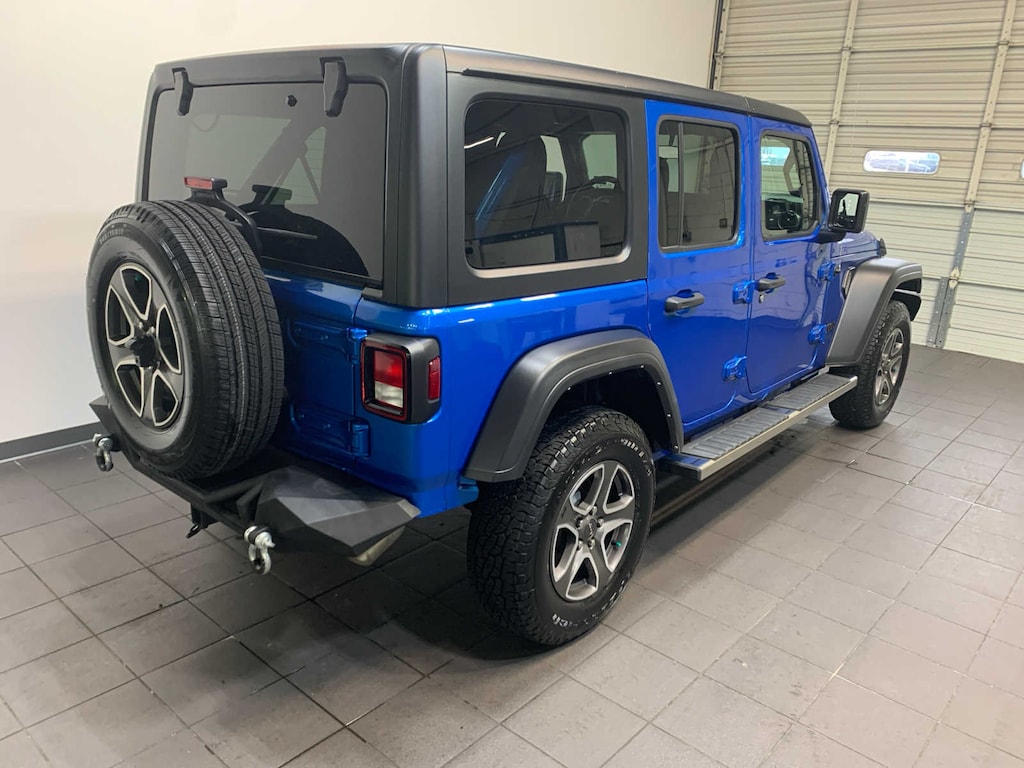 Engine: 2.0L I4 DOHC DI Turbo w/ESS, Transmission: 8-Speed Automatic (850RE), Front 1-Touch Down Power Windows, Speed Sensitive Power Locks, Sport S, Power Heated Mirrors, Automatic Headlamps, Leather Wrapped Steering Wheel, Security Alarm, Remote Keyless Entry, Sun Visors w/Illuminated Vanity Mirrors, Anti-Lock 4-Wheel Disc Brakes, Tip Start, Dana M200 Rear Axle, Selec-Speed Control, Freedom Panel Storage Bag, Rear Window Defroster, Rear Window Wiper/Washer, No Soft Top, Heated Steering Wheel, Heated Front Seats, Leather Wrapped Steering Wheel, WHEELS: 17 X 7.5 MACHINED GRANITE CRYSTAL, Universal Garage Door Opener, HYDRO BLUE PEARLCOAT, SiriusXM Radio Service, ENGINE: 2.0L I4 DOHC DI TURBO W/ESS. Jeep Unlimited Sport S with Hydro Blue Pearlcoat exterior and Black interior features a 4 Cylinder Engine with 270 HP at 5250 RPM*. Originally bought here